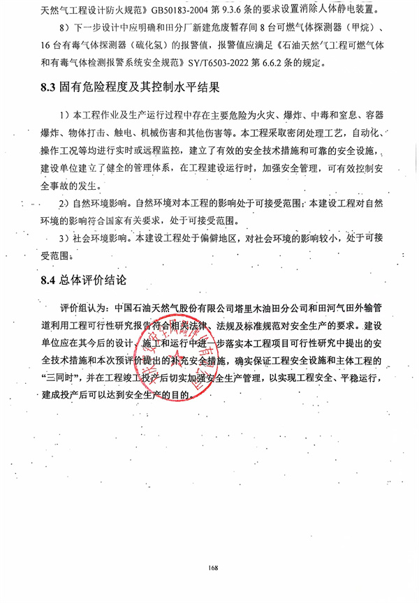 中國石油天然氣股份有限公司塔里木油田分公司和田河氣田外輸管道利用工程可行性研究報告符合相關(guān)法律、法規(guī)及標(biāo)準(zhǔn)規(guī)范對安全生產(chǎn)的要求。建設(shè)單位應(yīng)在其今后的設(shè)計、施工和運行中進(jìn)一步落實本工程項目可行性研究中提出的安全技術(shù)措施和本次預(yù)評價提出的補充安全措施,確實保證工程安全設(shè)施和主體工程的“三同時”,并在工程竣工投產(chǎn)后切實加強安全生產(chǎn)管理,以實現(xiàn)工程安全、平穩(wěn)運行,建成投產(chǎn)后可以達(dá)到安全生產(chǎn)的目的。 |