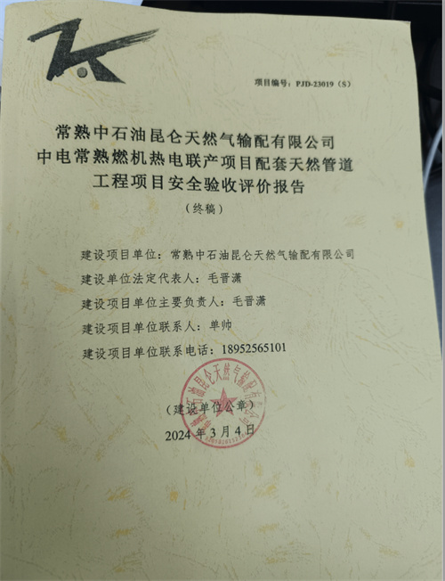 常熟中石油昆侖天然氣輸配有限公司中電常熟燃機(jī)熱電聯(lián)產(chǎn)項(xiàng)目配套天然管道工程項(xiàng)目安全設(shè)施竣工驗(yàn)收評價(jià)報(bào)告