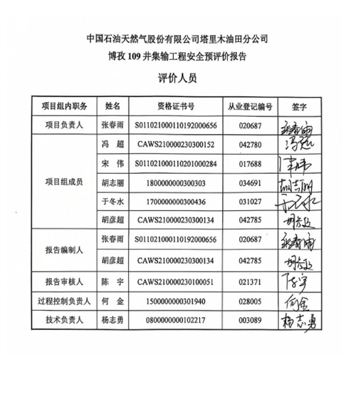 中國石油天然氣股份有限公司塔里木油田分公司博孜109井集輸工程方案符合相關法律、法規及標準規范對安全生產的要求。建設單位應在其今后的設計、施工和運行中進一步落實本工程方案提出的安全技術措施和本次預評價提出的補充安全措施,確實保證工程安全設施和主體工程的“三同時”,并在工程竣工投產后切實加強安全生產管理,以實現工程安全、平穩運行,本項目危險有害因素能夠得到控制,建成投產后,能達到有關法律、法規及標準規定的安全要求。 |