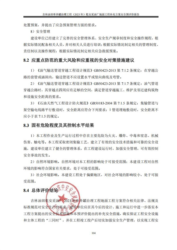 吉林油田乾安采油廠2023年單井罐治理工程地面工程方案符合相關法律、法規及標準規范對安全生產的要求。建設單位應在其今后的設計、施工和運行中進一步落實本工程方案提出的安全技術措施和本預評價提出的補充安全措施,確實保證工程安全設施和主體工程的“三同時”,并在工程竣工投產后切實加強安全生產管理,以實現工程安全、平穩運行,建成投產后可以達到安全生產的目的。 |