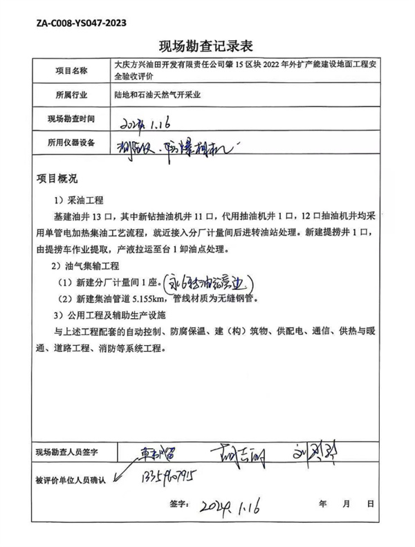 大慶油田有限責任公司方興分公司肇15區塊2022年外擴產能建設地面工程安全驗收評價