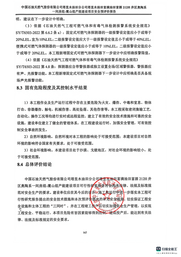中國石油天然氣股份有限公司塔里木油田分公司塔里木油田富滿油田富源212H井區(qū)奧陶系一間房組-鷹山組產(chǎn)能建設項目可行性研究報告符合相關法律、法規(guī)及標準規(guī)范對安全生產(chǎn)的要求。建設單位應在其今后的設計、施工和運行中進一步落實本工程可行性研究報告提出的安全技術措施和本次預評價提出的補充安全措施,切實保證工程安全設施和主體工程的“三同時”,并在工程竣工投產(chǎn)后切實加強安全生產(chǎn)管理,以實現(xiàn)工程安全、平穩(wěn)運行,本項目危險有害因素能夠得到控制,建成投產(chǎn)后,能達到有關法律、法規(guī)及標準規(guī)定的安全要求。 |