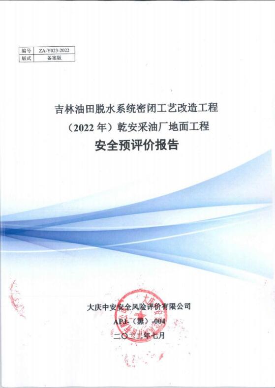 吉林油田脫水系統(tǒng)密閉工藝改造工程(2022年)乾安采油廠地面工程 安全評價報告