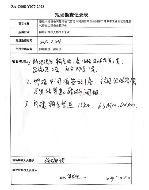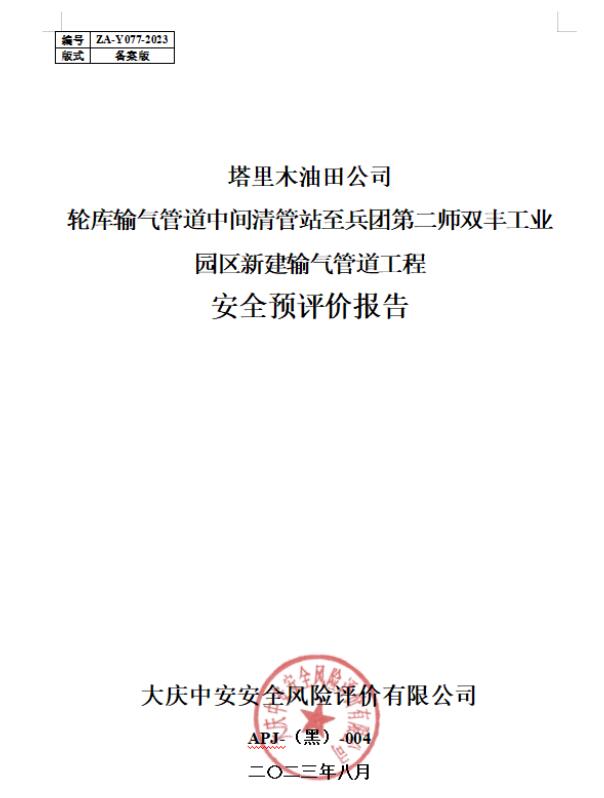 塔里木油田公司輪庫輸氣管道中間清管站至兵團(tuán)第二師雙豐工業(yè)園區(qū)新建輸氣管道工程安全預(yù)評價報(bào)告
