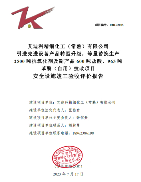 艾迪科精細化工(常熟)有限公司引進先進設(shè)備產(chǎn)品轉(zhuǎn)型升級,等量替換生產(chǎn)2500 噸抗氧化劑及副產(chǎn)品600 噸鹽酸、965 噸苯酚(自用)技改項目符合安全生產(chǎn)條件,具備安全設(shè)施竣工驗收條件。