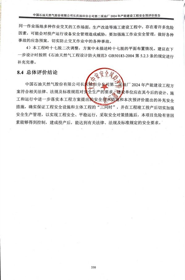 中國石油天然氣股份有限公司長慶油田分公司第二采油廠2024年產能建設工程方案符合相關法律、法規及標準規范對安全生產的要求。建設單位應在其今后的設計、施工和運行中進一步落實本工程方案提出的安全技術措施和本次預評價提出的補充安全措施,確實保證工程安全設施和主體工程的“三同時”,并在工程竣工投產后切實加強安全生產管理,以實現工程安全、平穩運行,采取安全對策措施后,本項目危險有害因素能夠得到控制,建成投產后,能達到有關法律、法規及標準規定的安全要求。 |